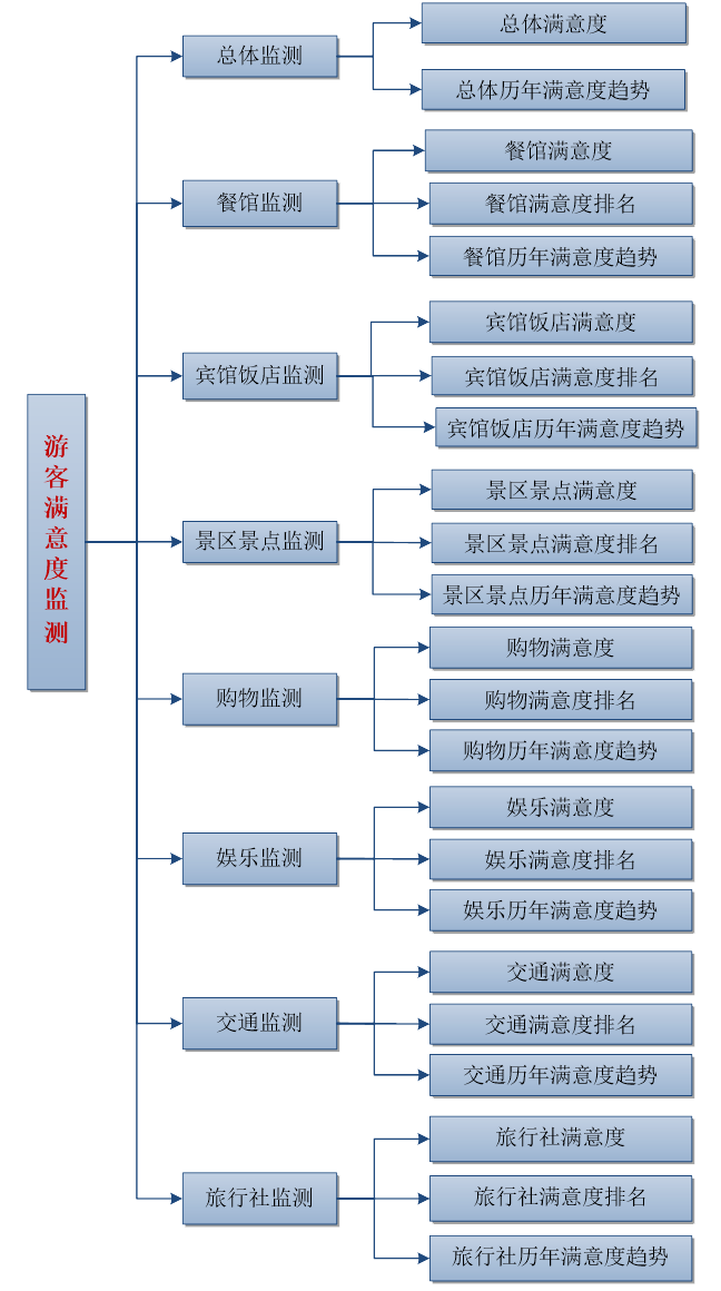 ● 總體監測:監測當前游客對旅游行業的總體滿意度,并分析歷年總體滿意度的發展趨勢;