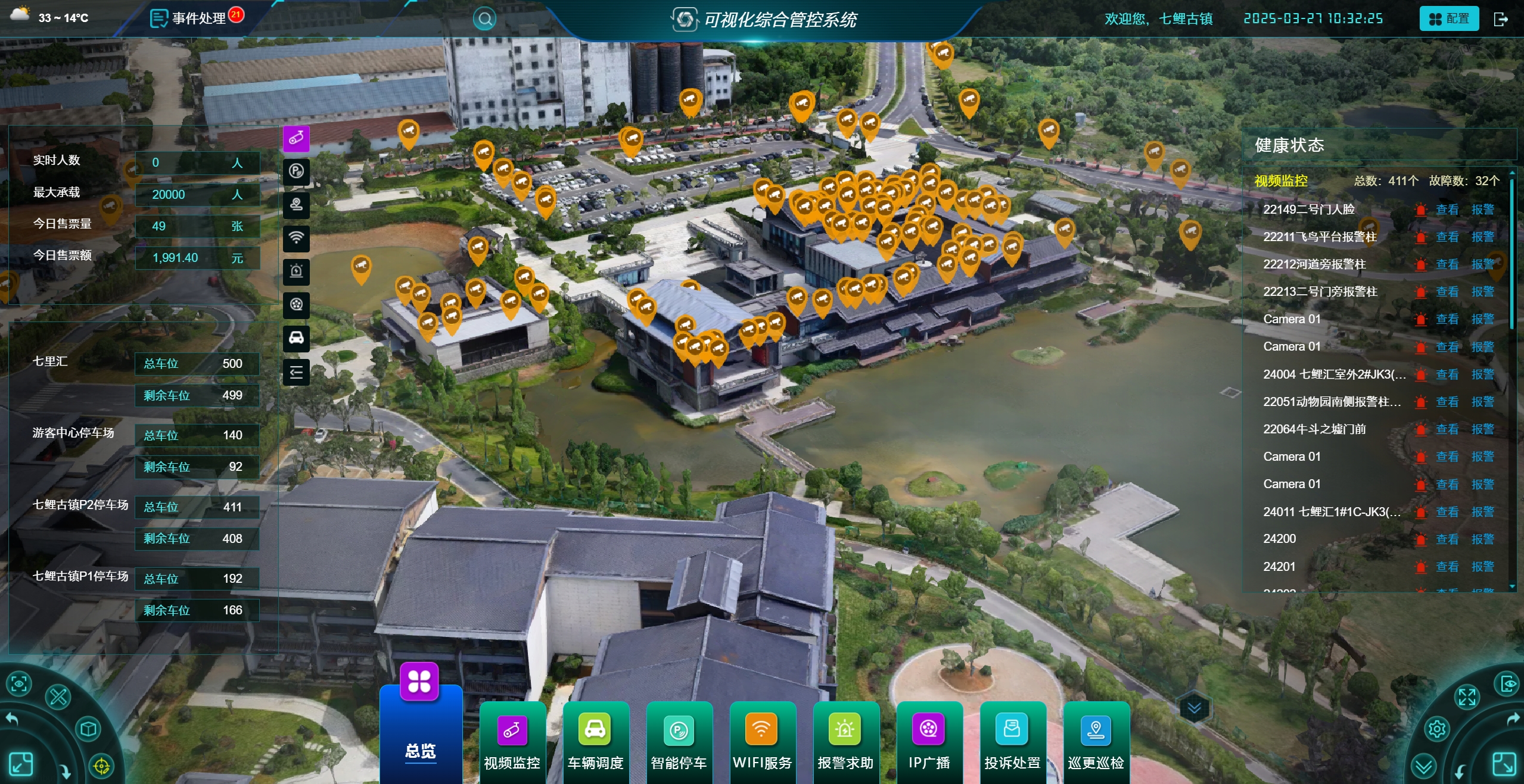 面向景區(qū)管理:景區(qū)地理信息平臺(tái)(景區(qū)地圖采用傾斜攝影三維建模),大數(shù)據(jù)可視化(具備景區(qū)展示、客流與車(chē)流態(tài)勢(shì)、 消費(fèi)統(tǒng)計(jì)、安防、票務(wù)統(tǒng)計(jì)、電商統(tǒng)計(jì)、投訴統(tǒng)計(jì)、會(huì)員統(tǒng)計(jì)、輿情監(jiān)測(cè)等展示功能),可視化綜合指揮平臺(tái)(可視化指揮調(diào)度系統(tǒng)(視頻指揮、車(chē)輛指揮、WIFI服務(wù)、報(bào)警求助、IP廣播調(diào)度、應(yīng)急指揮通訊、投訴處置、安防指揮等模塊)、應(yīng)急指揮管理系統(tǒng)(融合調(diào)度、GIS指揮、應(yīng)急預(yù)案、應(yīng)急事件、應(yīng)急值守、通訊錄等管理功能))。