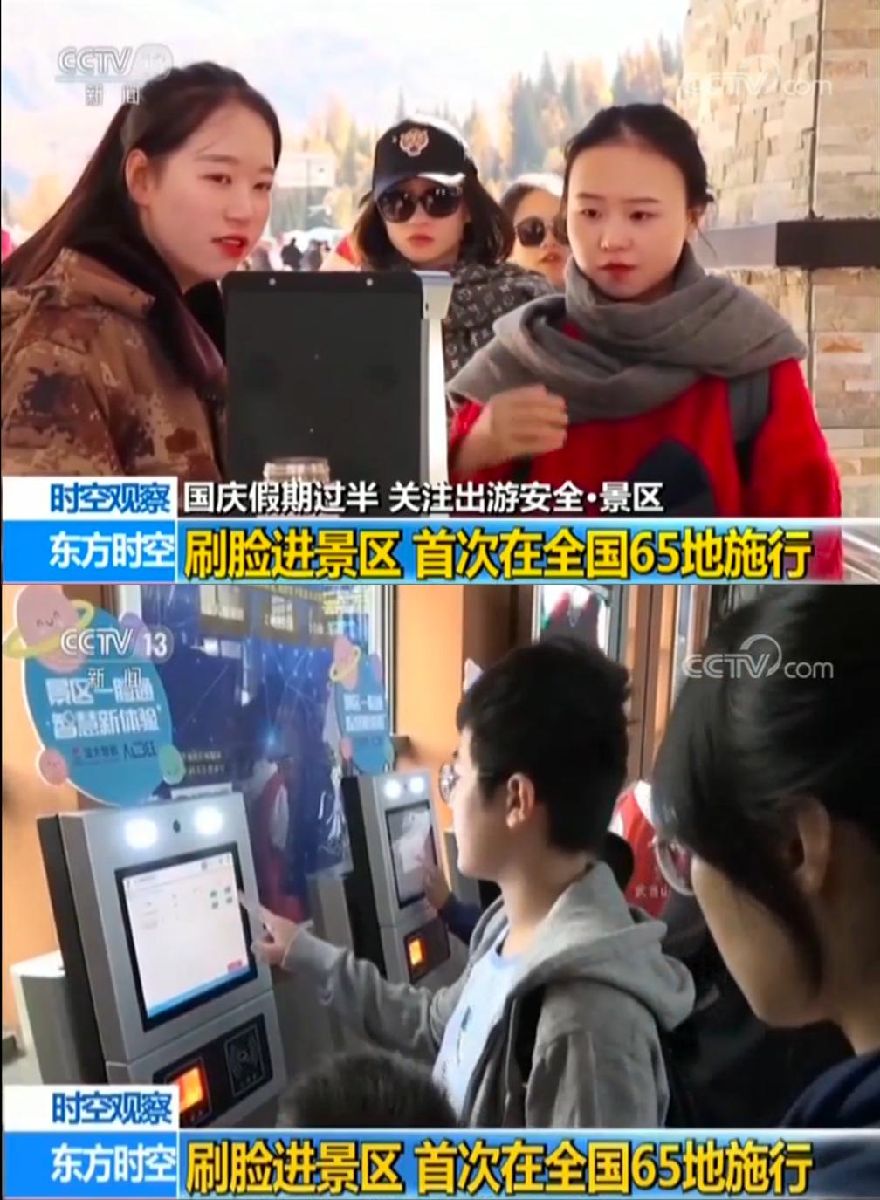 游客刷臉注冊購票后,入園時無須出示門票與身份證,人臉識別閘機可自動對游客臉部進行掃描確認,只需1秒便可快速進入景區。”十一期間,CCTV13《東方時空》《24小時》《朝聞天下》《新聞30分》《共同關注》《新聞直播間》,CCTV2《經濟信息聯播》《第一時間》、CCTV4《中國新聞》共9檔央視名牌欄目集中報道——今年十一黃金周,國內65家知名景區已開啟“刷臉入園”模式。值得一提的是,這套在全國景區首次大范圍應用的刷臉入園系統,出自Aibee和深大智能聯合首創的全域旅游AI升級方案,方案問世僅半年,已迅速展露“規模效應”。
