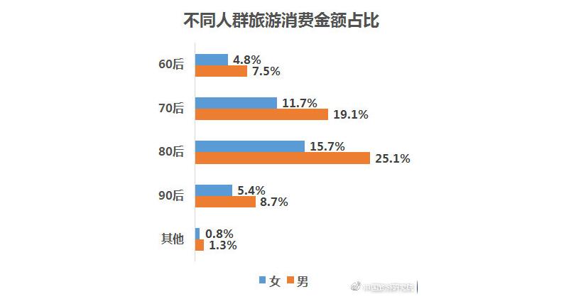 報告顯示,旅游消費人群中,買單男性多于女性,70后及80后人群為主力消費人群,90后人群數量快速增長。從旅游消費金額來看,80后男性旅游消費貢獻最高,占比超25%。