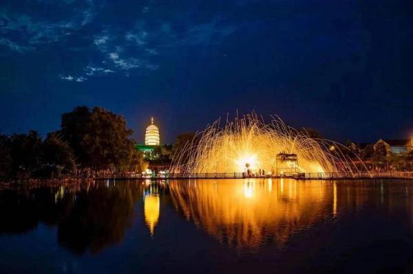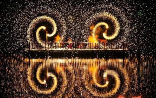 國(guó)家級(jí)非遺打鐵花技藝在漁灣景區(qū)獲得了前所未有的表達(dá)維度。這項(xiàng)始于北宋的古老技藝,曾只是單一的民俗表演,如今在數(shù)字技術(shù)的加持下煥發(fā)新生。2025版《夢(mèng)幻漁灣》中,打鐵花已升級(jí)至2.0版本,與重慶銅梁火龍表演深度交融——表演者赤膊舞動(dòng)噴火巨龍,在鐵花飛濺的夜空下騰挪跳躍,形成“火樹(shù)銀花龍?jiān)谔臁钡钠嬗^。